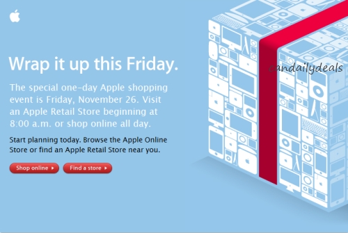 I got a mysterious email from Apple today about a special one-day Apple shopping event this Friday, November 26, 2010. The sale is at Apple retail stores and online beginning 8am. You can browse the Apple online store now or stores to plan your holiday shopping. Not all sale products are available in all Apple Retail Stores. Product specifications are subject to change. Sale prices are limited to stock on hand and while supplies last. I wonder what will be on sale, checking the Apple website it goes on to say "you'll find dozens of great iPad, iPod, and mac gifts for everyone on your list." I wonder what they will have on sale!Click here to find an Apple store near you.