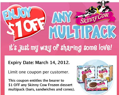 Skinny Cow is offering a special coupon for Valentine's Day! This coupon gives you $1 off any Skinny Cow frozen dessert multipacks (bars, sandwiches and cones). This coupon is valid until March 14, 2012. Limit of one coupon per customer.